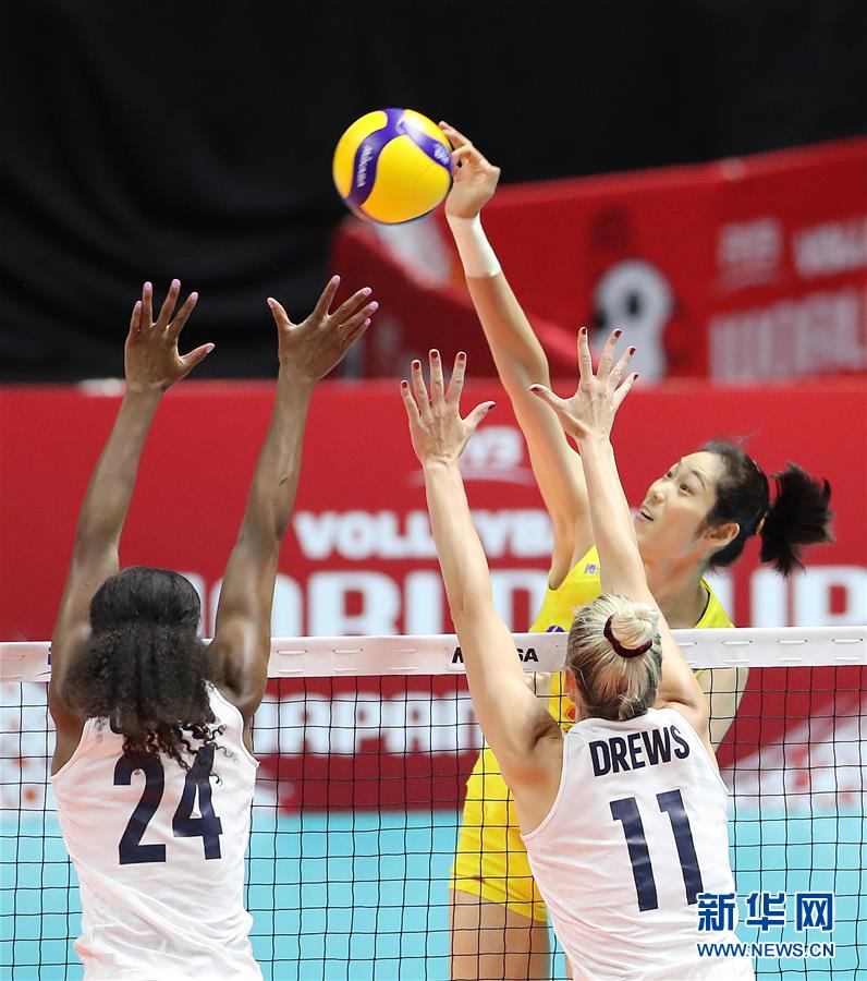 9月23日,中国队球员朱婷(右)在比赛中扣球。当日,在日本札幌举行的2019年女排世界杯赛第二阶段A组循环赛中,中国队以3比0战胜美国队。新华社记者杜潇逸摄