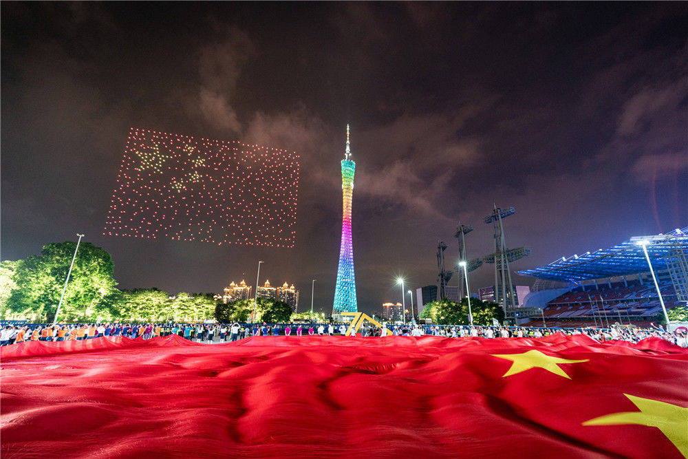 2019年8月30日,广州,“我和国旗同框”线下活动首站来到广州花城广场,999架无人机编队表演,闪耀花城广场,吸引了众多游客观看。方杰/视觉中国