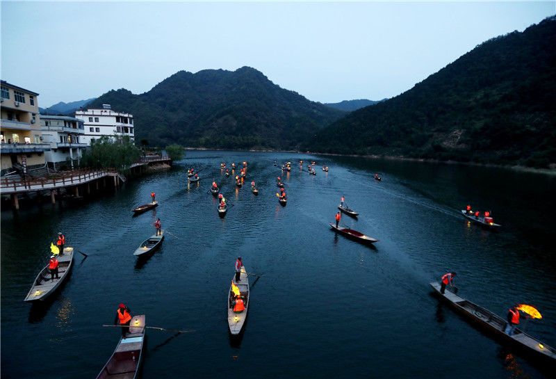 2019年9月25日,杭州淳安县宋村乡云港口村,渔民们划着小船点亮渔火聚集在湖面,再现难得一见的“渔舟唱晚”盛景。浙江在线/林云龙/视觉中国编辑/陈进