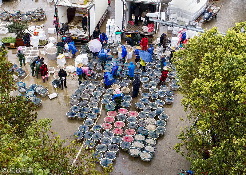 浙江台州三门县花桥镇栅下村的文化礼堂前,村民们冒雨和商贩交易蛏苗,现场一片繁忙。