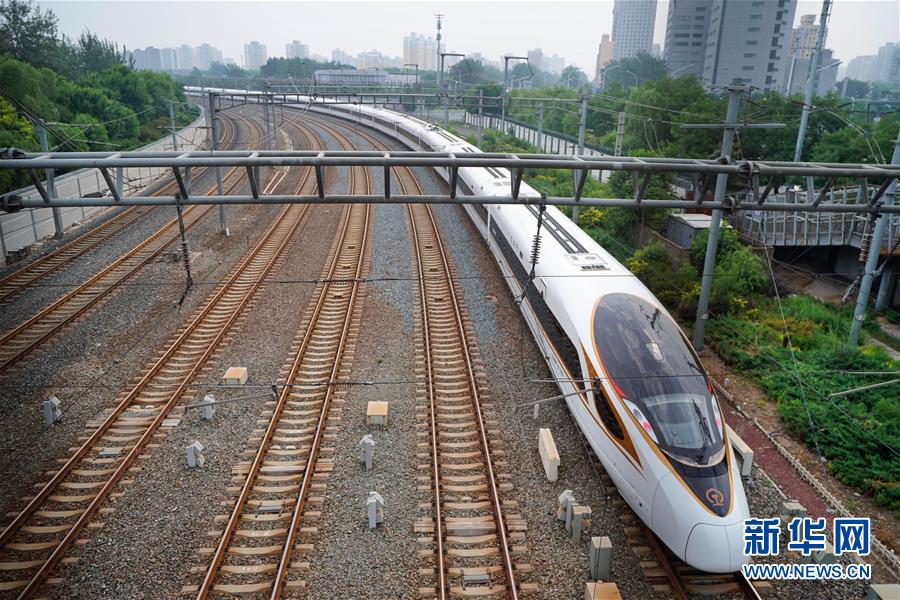 2018年7月1日,整备好的G7次列车驶向北京南站,准备发往上海。此列G7列车是从北京开出的首趟正式运营的长编组“复兴号”动车组。 新华社记者邢广利摄