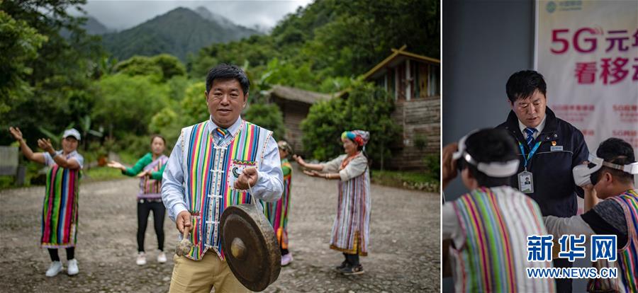 这是一张拼版照片。左图:在怒江傈僳族自治州贡山县独龙江乡移动营业厅上班的马春海(独龙族)。在他身后,独龙族群众在跳本民族舞蹈(6月21日摄);右图:马春海在指导当地群众体验5G虚拟现实设备。独龙江乡今年开通了5G试验基站(6月21日摄)。新华社记者 江文耀 摄