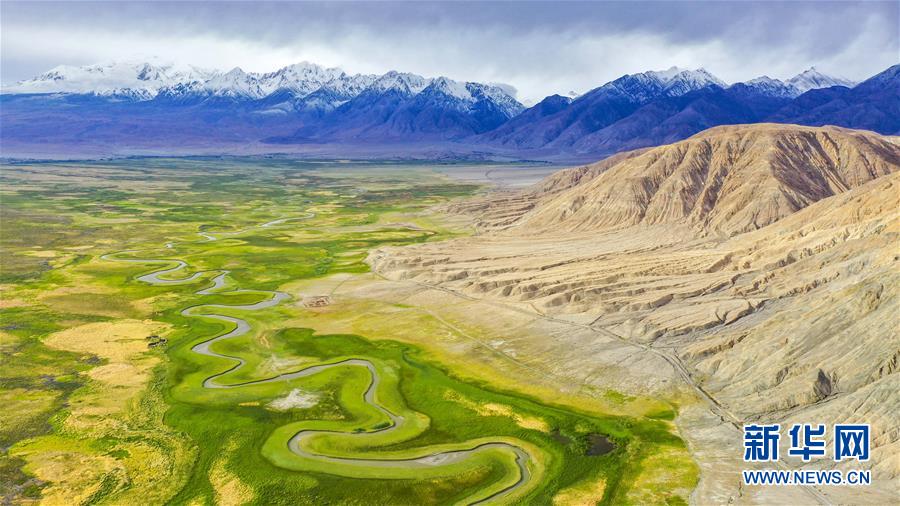 这是新疆塔什库尔干塔吉克自治县塔合曼湿地一景(6月30日无人机拍摄)。新华社记者胡虎虎摄