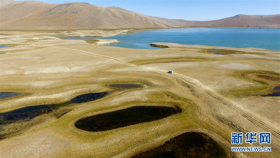 快递车将网购的商品送到新疆青河县查干郭勒乡萨尔布拉克村的牧场(2018年8月24日无人机拍摄)。新华社记者江文耀摄