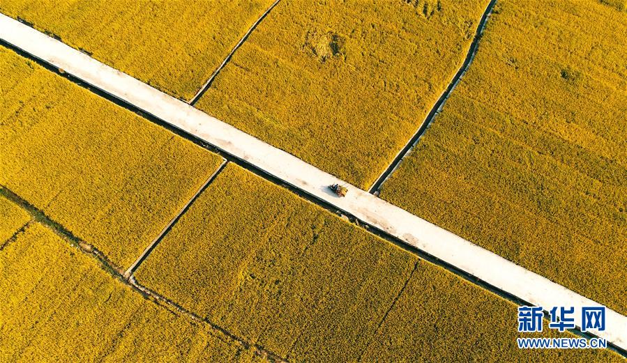 这是9月30日无人机拍摄的河北省涉县白芟村的稻田。 近日,位于太行山下的河北省涉县白芟村上千亩水稻逐渐成熟。从空中俯瞰,犹如一块块“调色盘”,美不胜收。 新华社记者 王晓 摄