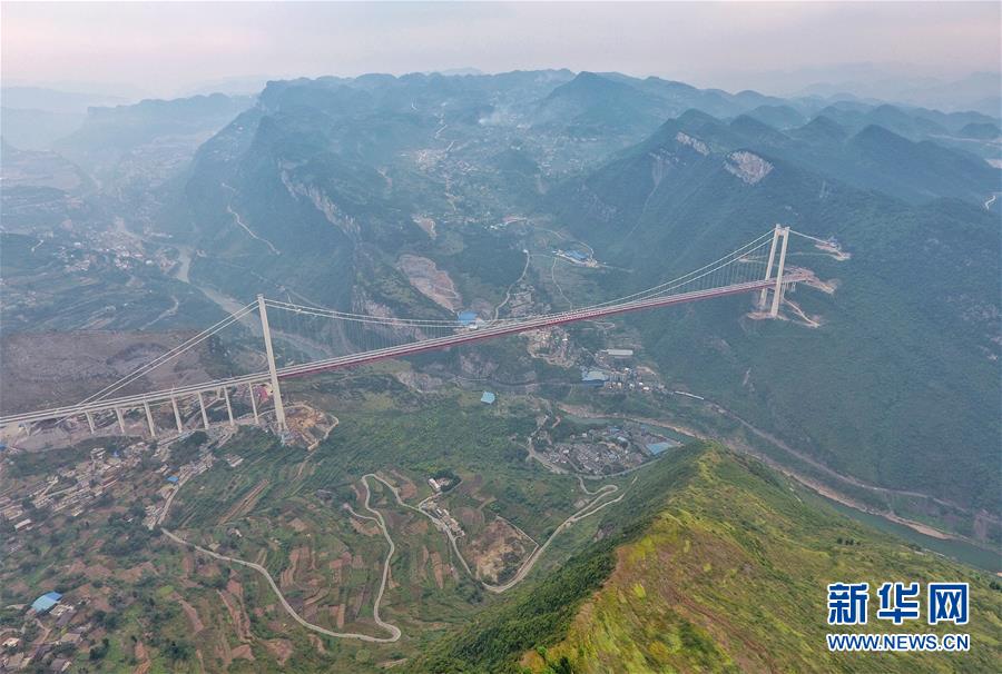 赤水河红军大桥全长2009米,主跨1200米,主塔高243.5米,在全国山区同类型钢桁梁悬索桥梁中排名前列,由四川省铁投集团投资、四川路桥集团承建,于2017年上半年开工。 新华社记者刘坤摄