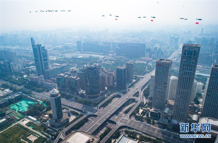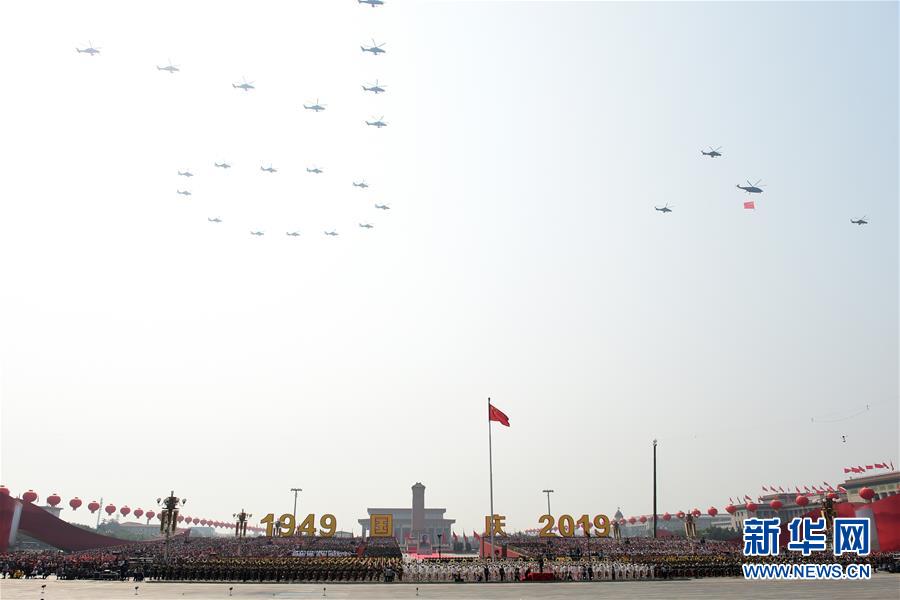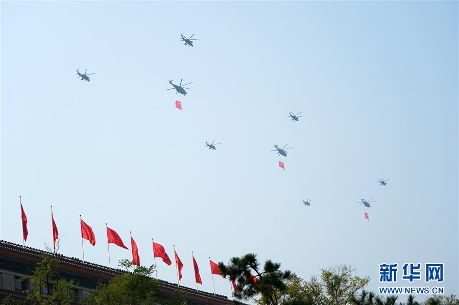 10月1日上午,庆祝中华人民共和国成立70周年大会在北京天安门广场隆重举行。这是空中护旗梯队。新华社记者肖艺九摄
