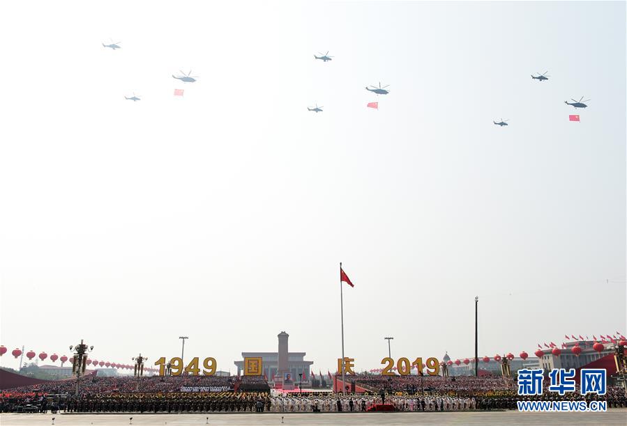 10月1日上午,庆祝中华人民共和国成立70周年大会在北京天安门广场隆重举行。这是空中护旗梯队飞过天安门广场上空。新华社记者庞兴雷摄