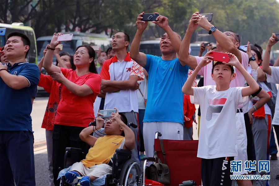 10月1日,市民在北京南新华街拍摄飞过北京上空的受阅飞机。当日是国庆节,全国各地的人们用各种方式欢度节日。新华社记者 薛东梅 摄