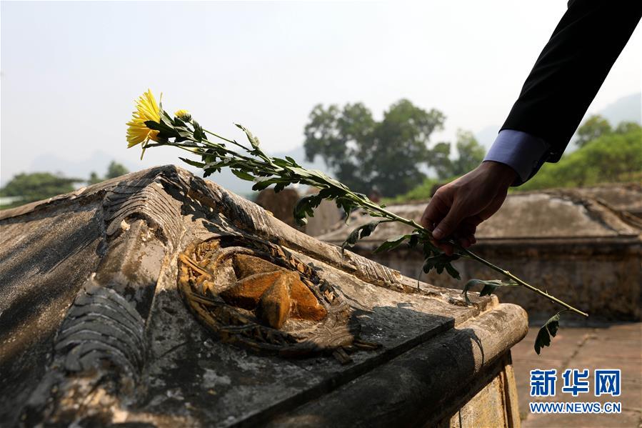 9月30日,在越南北部河南省,人们用鲜花祭奠中国援越烈士。 中国驻越南大使馆馆员、中国援越老战士及其亲属、在越中资机构和留学生代表等30日前往位于越南河南省的金榜烈士陵园,祭奠长眠于此的14名中国援越烈士。越中友协副主席阮荣光等越方代表也参加了祭扫活动。 新华社记者 王迪 摄