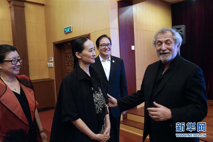 10月2日,芭蕾编舞大师鲍里斯·艾夫曼(右一)与第四届中国国际芭蕾演出季艺术总监冯英(左二)在演出前交流。新华社记者 金良快 摄