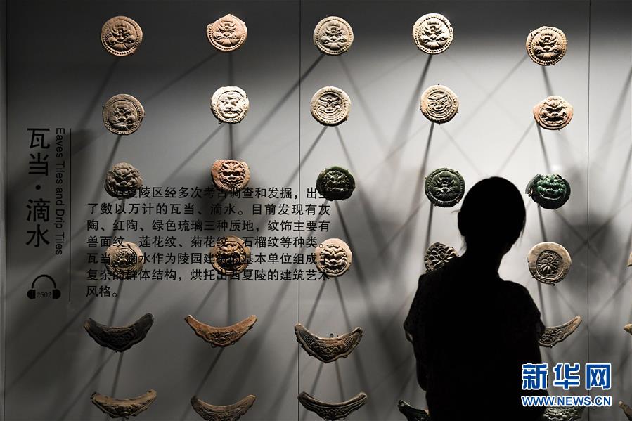 10月2日,游客在宁夏银川市西夏陵景区的西夏博物馆观看展出的瓦当、滴水。 新华社记者 冯开华 摄