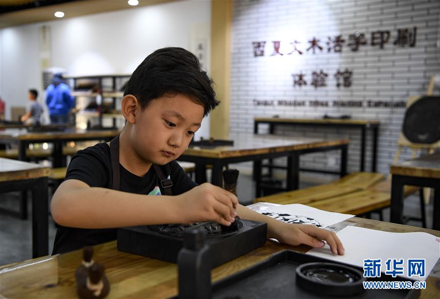 10月2日,游客在宁夏银川市西夏陵景区体验西夏文木活字印刷。 新华社记者 冯开华 摄