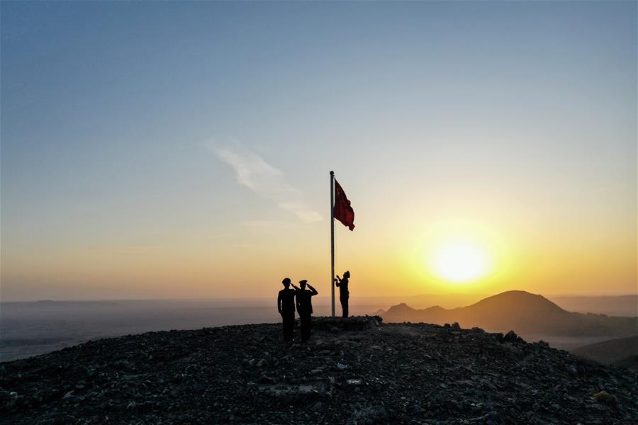 9月27日,内蒙古自治区额济纳旗算井子边境派出所民警在大红山上举行升国旗仪式(无人机拍摄)。新华社记者刘磊摄