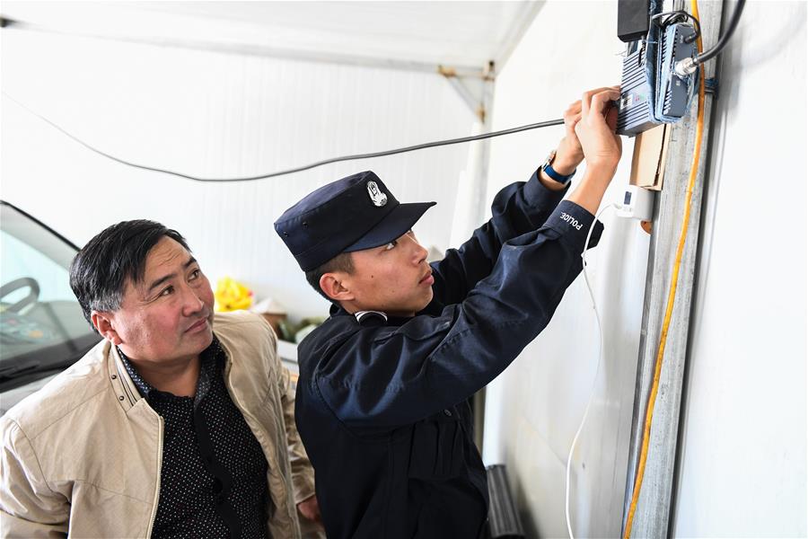 9月25日,内蒙古自治区额济纳旗算井子边境派出所民警崔现浦(右)在帮牧民敖其尔修理家用电器。新华社记者刘磊摄