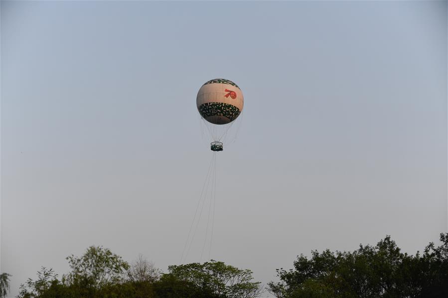 10月3日,游客在西溪国家湿地公园搭乘“空中揽胜”高空氦气球观光。 当日是国庆假期第三天,大批游客来到位于杭州的西溪国家湿地公园游玩,在江南诗意的环境中休闲度假。 新华社记者 黄宗治 摄