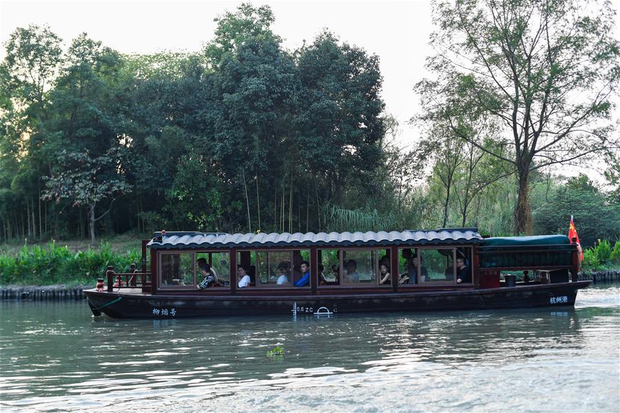10月3日,游客在西溪国家湿地公园乘船游览。 当日是国庆假期第三天,大批游客来到位于杭州的西溪国家湿地公园游玩,在江南诗意的环境中休闲度假。 新华社记者 黄宗治 摄