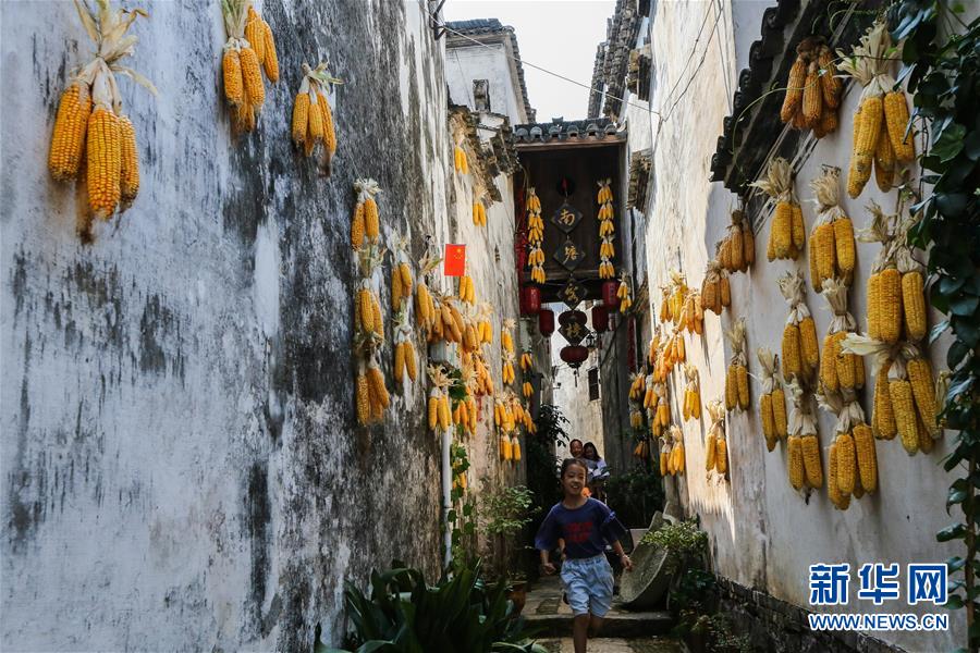 10月5日,游客在新叶古村的巷子内观赏美景。新华社记者徐昱摄
