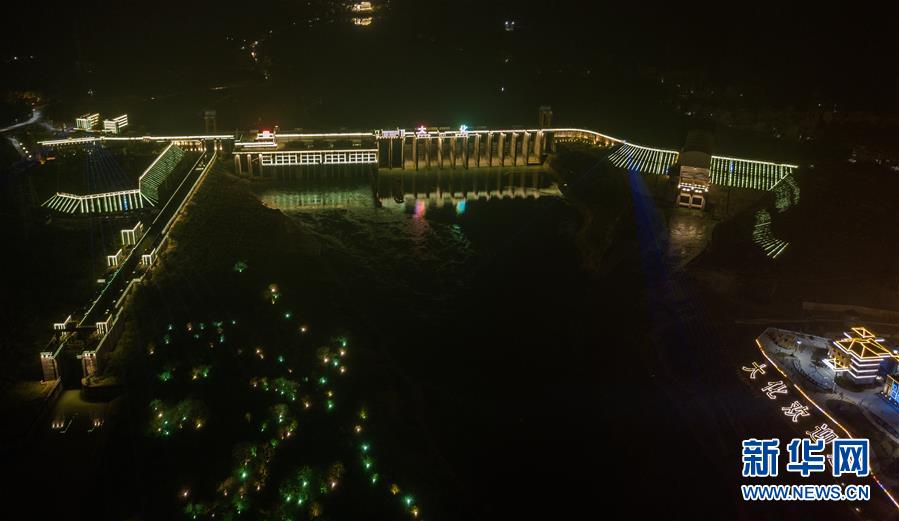 这是位于广西大化县境内的大化水电站夜景(10月21日无人机拍摄)。新华社记者张爱林摄