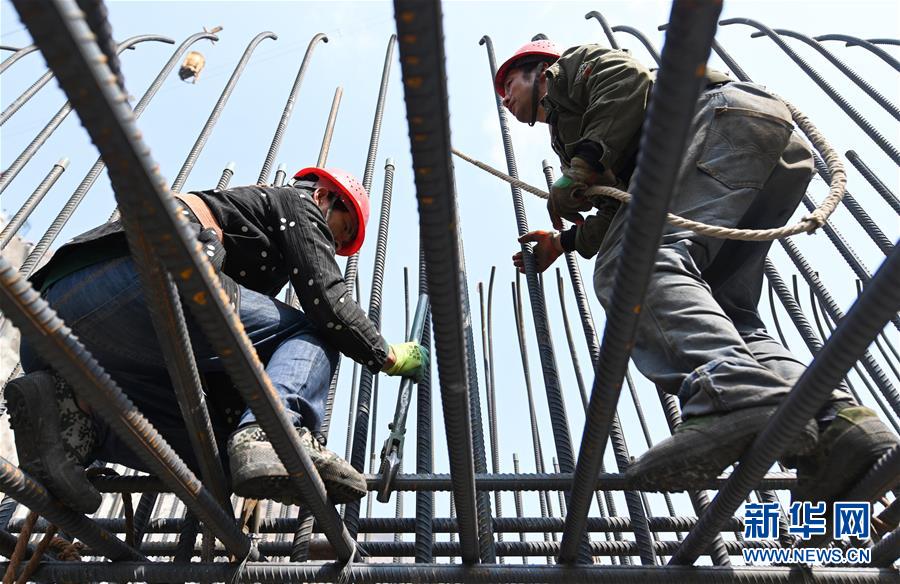 10月6日,工人在大藤峡水利枢纽工程工地上调整钢筋安装位置。新华社记者曹祎铭摄