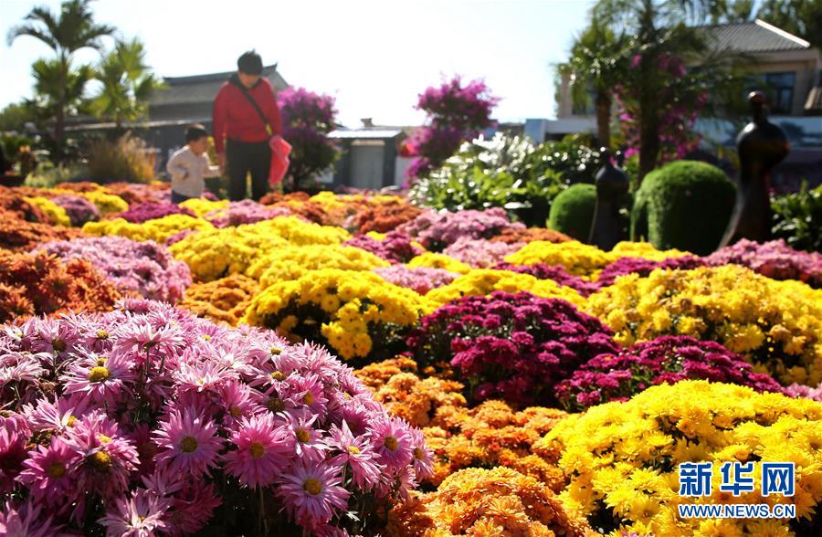 10月8日,在大厂回族自治县小厂村,游客在欣赏菊花。