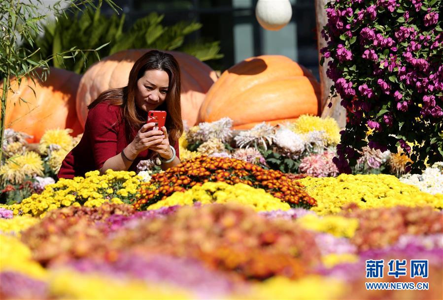 10月8日,在大厂回族自治县小厂村,游客在菊花展上拍照留念。新华社记者 王晓 摄
