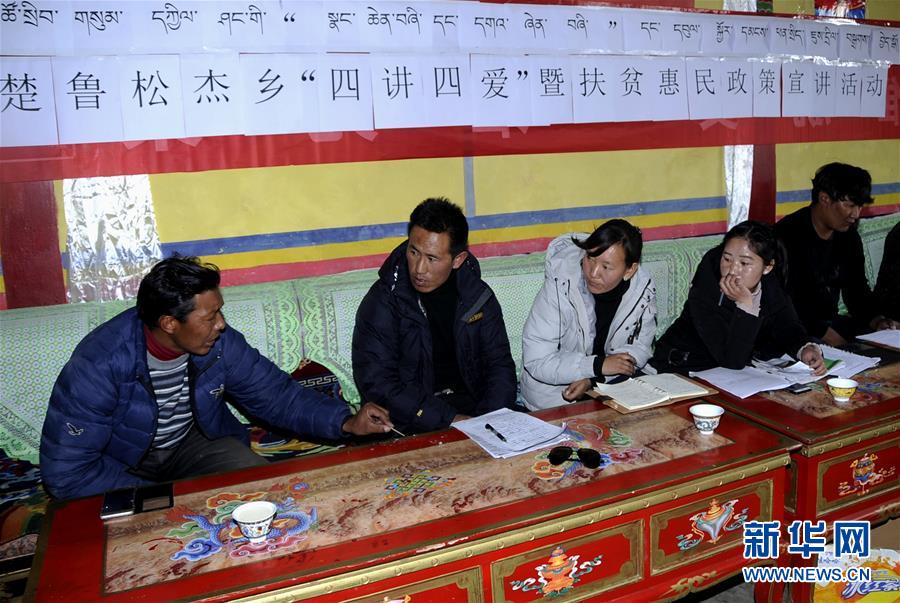 卓玛(右二)在巴卡村进行扶贫惠民政策宣讲,听取群众的意见和建议(3月27日摄)。新华社记者 陈尚才 摄