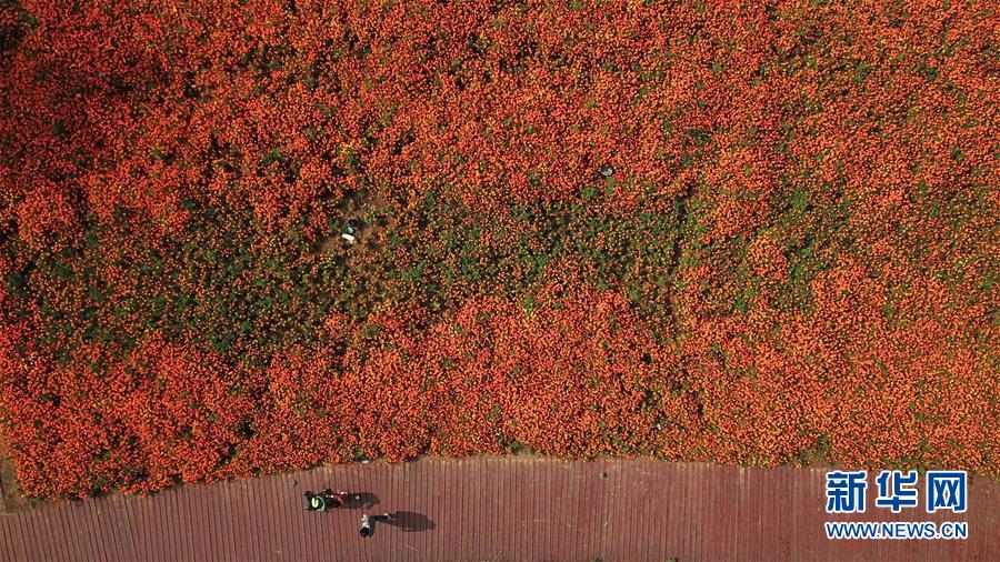 10月9日,游人在四季花海城市公园游览(无人机拍摄)。 秋日时节,位于安徽省合肥市的四季花海城市公园花香四溢,色彩缤纷,成为游客和市民休闲游玩的好去处。 新华社记者 张端 摄