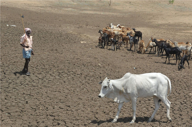 当地时间2017年5月30日,印度特伦甘纳,印度农民在干涸的河床上放羊和牛。NOAH SEELAM/视觉中国 编辑/陈进