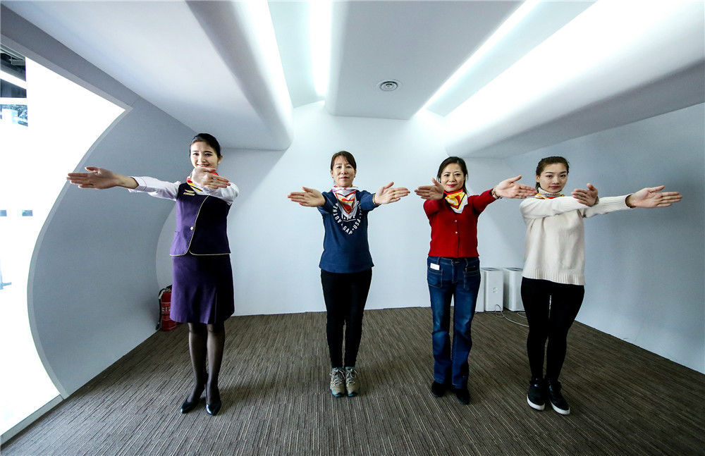 电影《中国机长》票房表现亮眼,也将大众的目光吸引到“空乘”这个历来被众人误解很多的职业上来。图为2018年3月2日,北京,市民跟随北京媒体一起来到了顺义区的航空训练基地,体验空姐、女安全员们的日常训练生活。图为空姐形象代言人在教市民空中礼仪。乔健/千龙图像/视觉中国