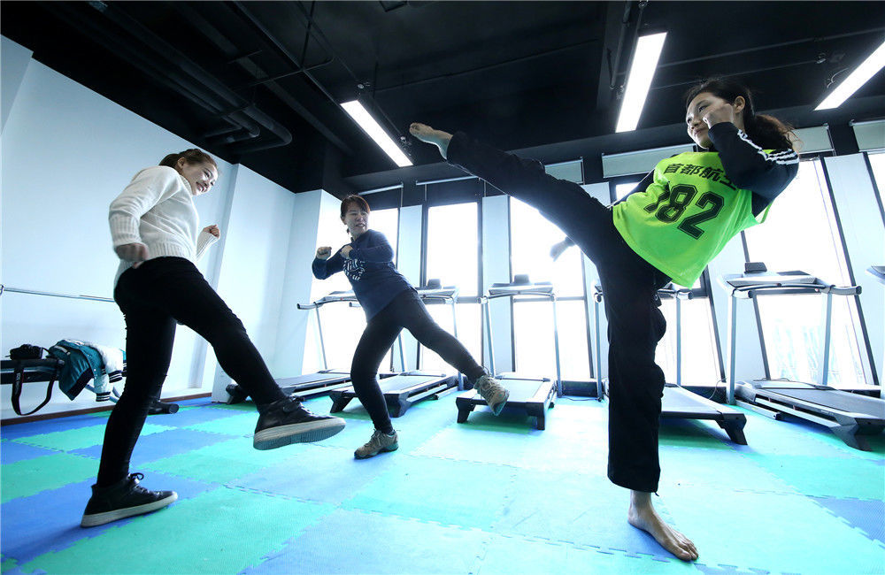 凌晨起床化妆,时刻保持身材和仪态,日常训练提高“武力值”保护乘客,零下十几二十多度穿着丝袜站在舱门口迎客,日常嘘寒问暖,发生紧急情况冲在一线……图为2018年3月2日,北京,市民跟随北京媒体一起来到了顺义区的航空训练基地,体验空姐、女安全员们的日常训练生活。图为空中女安全员在训练中。乔健/千龙图像/视觉中国