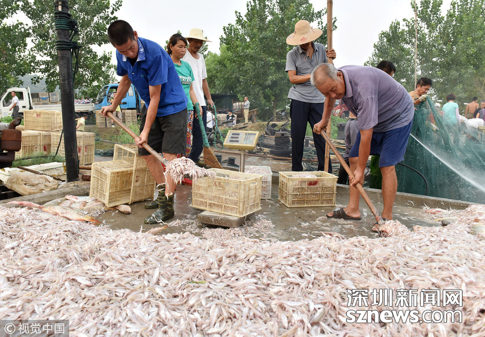 2018年8月16日,安徽巢湖渔民正在装运捕捞上来的毛鱼和银鱼。
