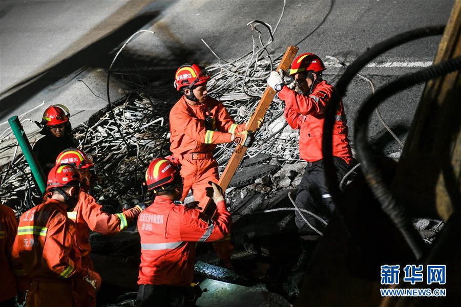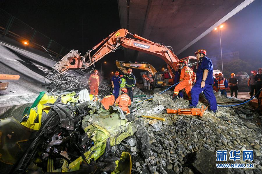 2019年10月10日晚,江苏无锡,312国道上海方向锡港路上跨桥路段出现桥面垮塌,现场有多辆轿车被压,具体伤亡情况不详。救援车辆已抵达现场。