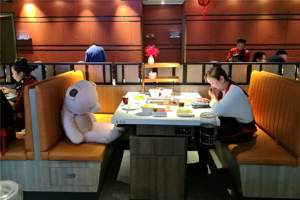 2018年1月29日,零下20多度的银川,一家火锅店内,女孩一个人吃饭,对面摆放着玩具熊。一止/视觉中国