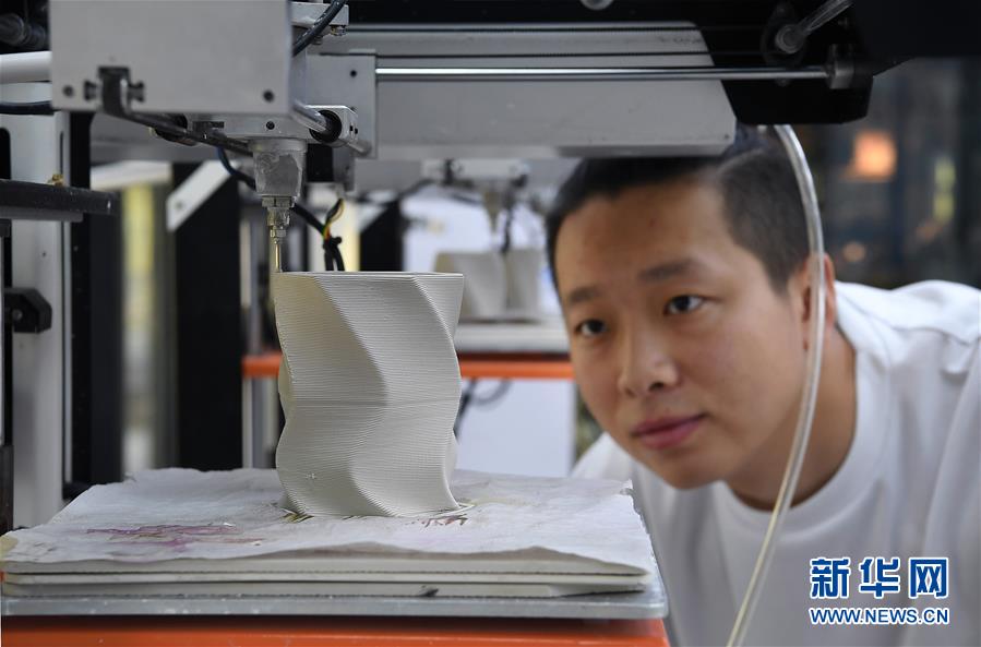 在江西景德镇陶溪川文创街区的陶瓷3D打印体验中心,一位工作人员在用3D打印技术制作陶瓷花瓶(7月26日摄)。新华社记者 万象 摄
