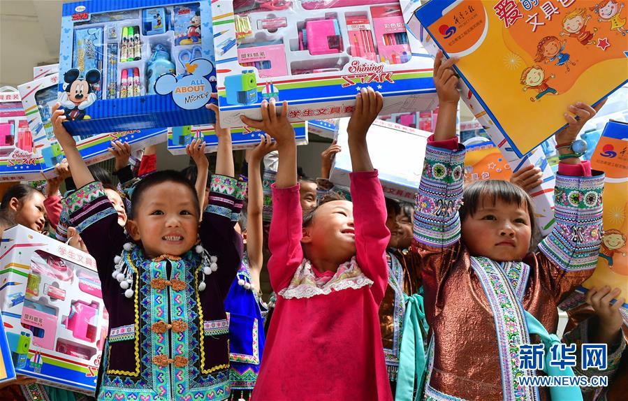 黔桂乌英苗寨的孩子们收到志愿者赠送的文具(10月11日摄)。新华社记者 黄孝邦 摄