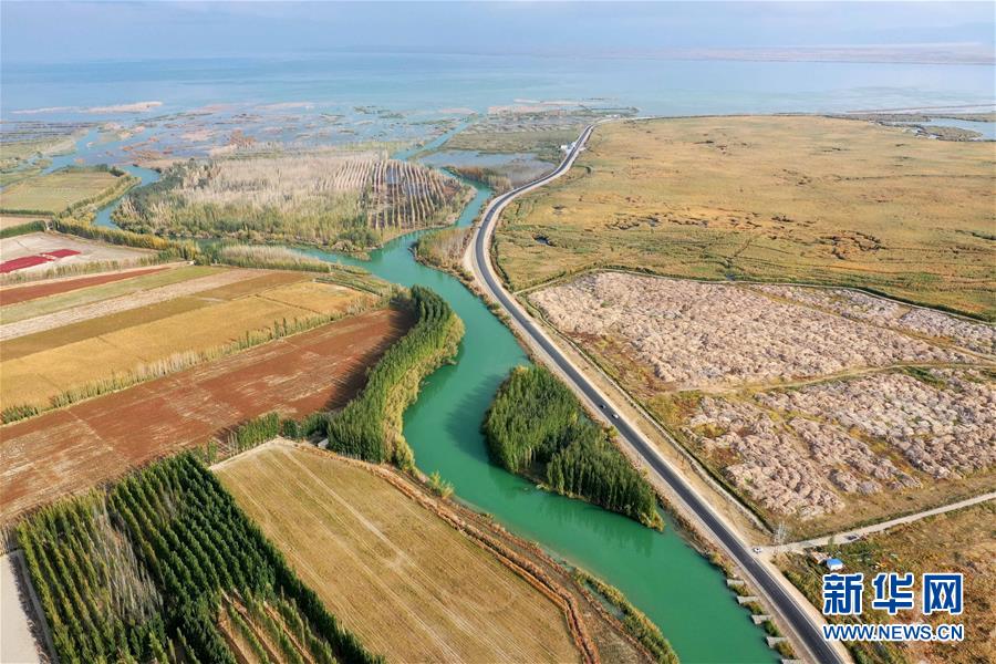 开都河支流汇入博斯腾湖(10月12日无人机拍摄)。入秋以来,新疆博斯腾湖碧波荡漾,美景如画,吸引各地游客前来游玩。新华社记者丁磊摄