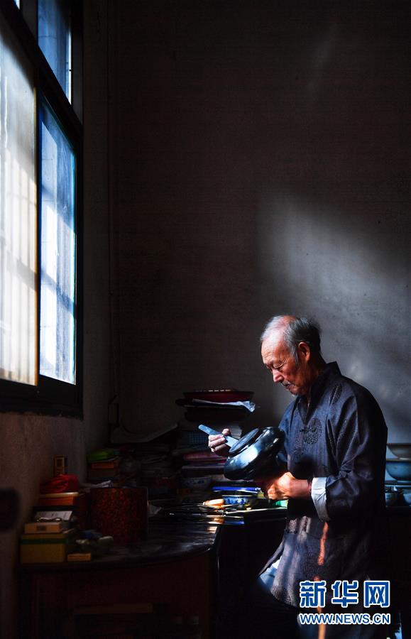10月12日,丁国坤在家中为一件未成形的脱胎漆器进行“上漆”工序。
