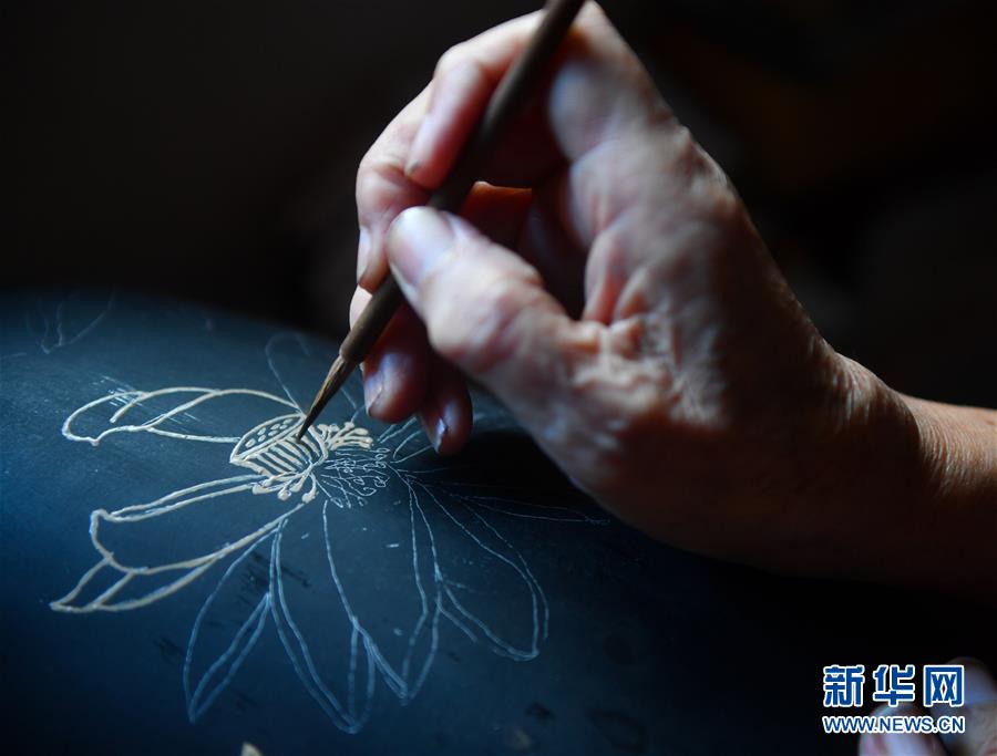 10月12日,丁国坤在家中将金属花纹图案镶嵌在一件脱胎漆器上。新华社记者胡晨欢摄