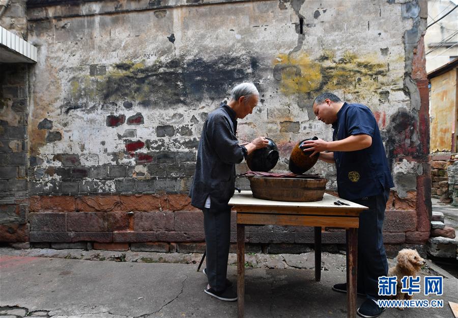 10月12日,丁国坤(左)和徒弟在家门口对未成形的脱胎漆器进行“磨显”工序。新华社记者胡晨欢摄