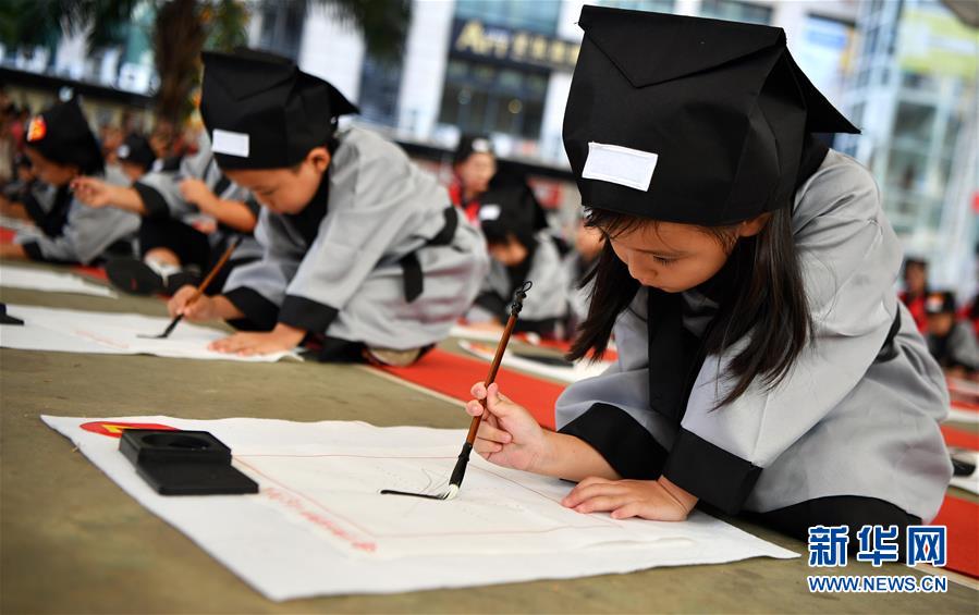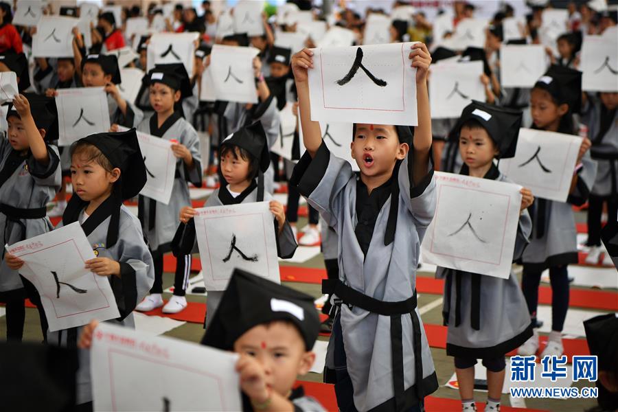 10月13日,参加仪式的小朋友在书写“人”字。当日,海口胡画少儿艺术中心为500名小朋友举行“开笔礼”,通过“点朱砂,启智慧”“习书法,描人字”等仪式让孩子们体验中国传统文化。新华社记者郭程摄