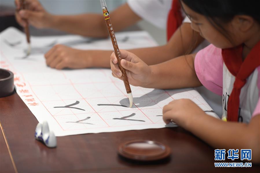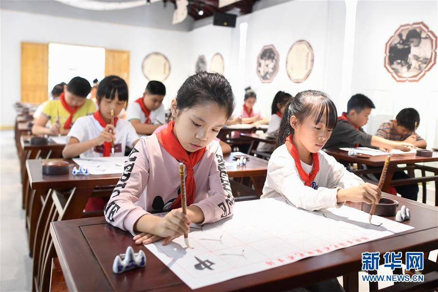 10月14日,小学生在非遗活态传承馆使用湖笔练习书法。 新华社记者 黄宗治 摄