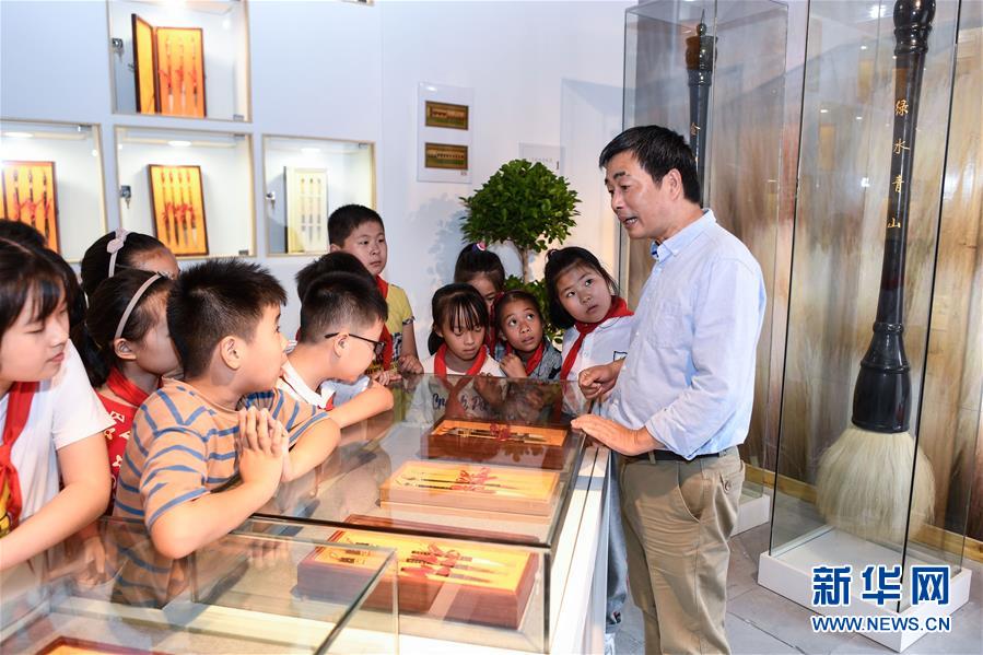10月14日,小学生在非遗活态传承馆观看湖笔的实物展示。新华社记者 黄宗治 摄
