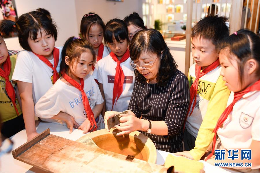 10月14日,善琏湖笔厂工人王晓华(右三)在非遗活态传承馆展示湖笔制作的水盆工艺。 新华社记者 黄宗治 摄