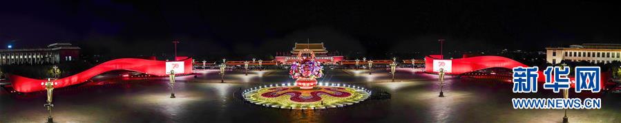 这是10月14日拍摄的天安门广场中心花坛(全景拼接图片)。 10月14日,以“花果篮”为主造型的天安门广场中心花坛吸引了众多游客参观拍照。“花果篮”的夜景更是流光溢彩,绚烂迷人。 新华社记者 殷刚 摄