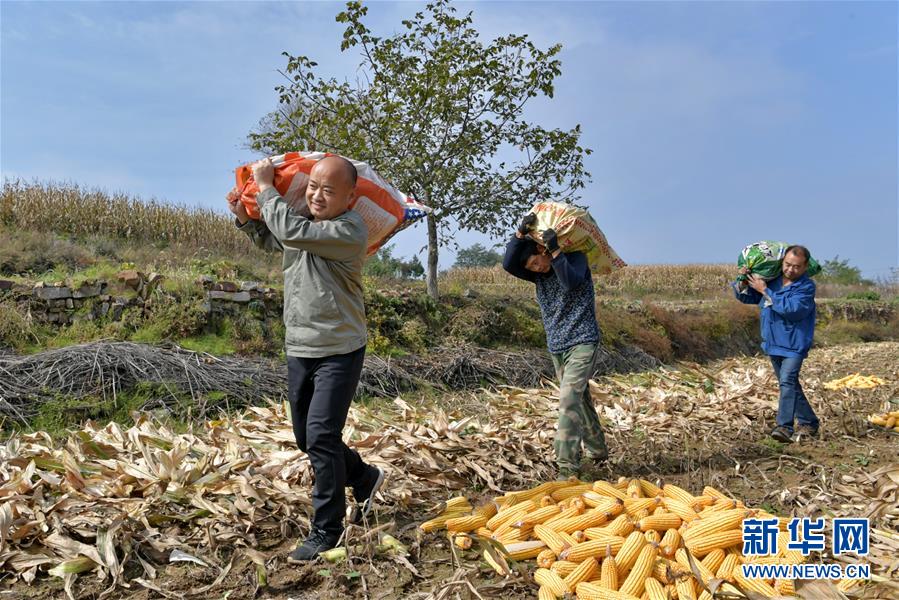 在夺火乡高谷堆村,第一书记侯俊国(左)在帮助村民收玉米(10月13日摄)。 新华社记者 曹阳 摄