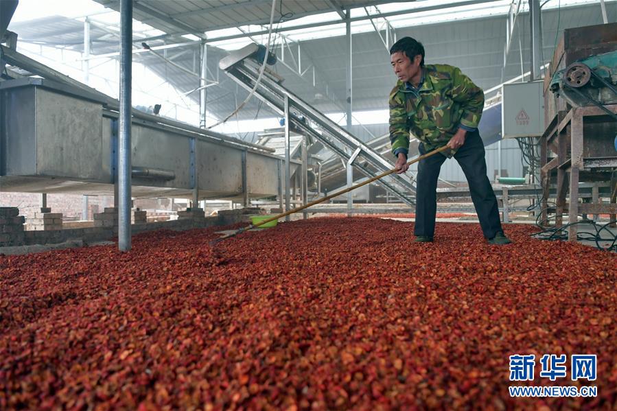 在夺火乡高谷堆村,村民在晾晒山楂片(10月14日摄)。 新华社记者 曹阳 摄
