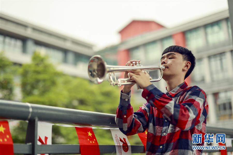 王太樊在教室外的楼道给自己心爱的小号试音(10月10日摄)。 新华社记者 刘潺 摄