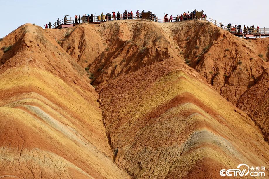 央视网消息:2019年10月15日,金秋时节,位于甘肃省张掖市临泽县的七彩丹霞景区进入旅游旺季,吸引众多游人纷至沓来。张掖七彩丹霞景区,分布面积约50公里,是中国北方干旱地区发育最典型的丹霞地貌。在方圆数十平方公里的范围内,随处可见有红、黄、橙、绿、白等多种鲜艳的色块或线条,把一座座山峰,一条条沟壑,装点成一幅幅绚丽多姿、灿烂夺目的画图。图片来源:视觉中国