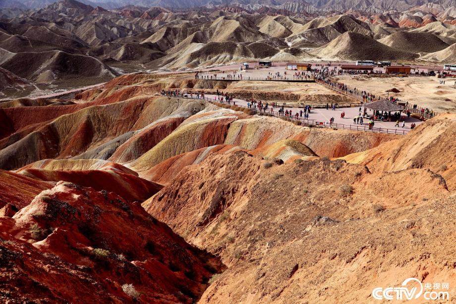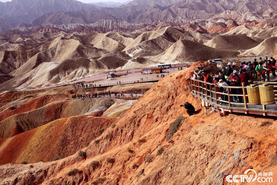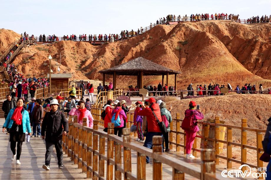 央视网消息:2019年10月15日,金秋时节,位于甘肃省张掖市临泽县的七彩丹霞景区进入旅游旺季,吸引众多游人纷至沓来。张掖七彩丹霞景区,分布面积约50公里,是中国北方干旱地区发育最典型的丹霞地貌。在方圆数十平方公里的范围内,随处可见有红、黄、橙、绿、白等多种鲜艳的色块或线条,把一座座山峰,一条条沟壑,装点成一幅幅绚丽多姿、灿烂夺目的画图。图片来源:视觉中国